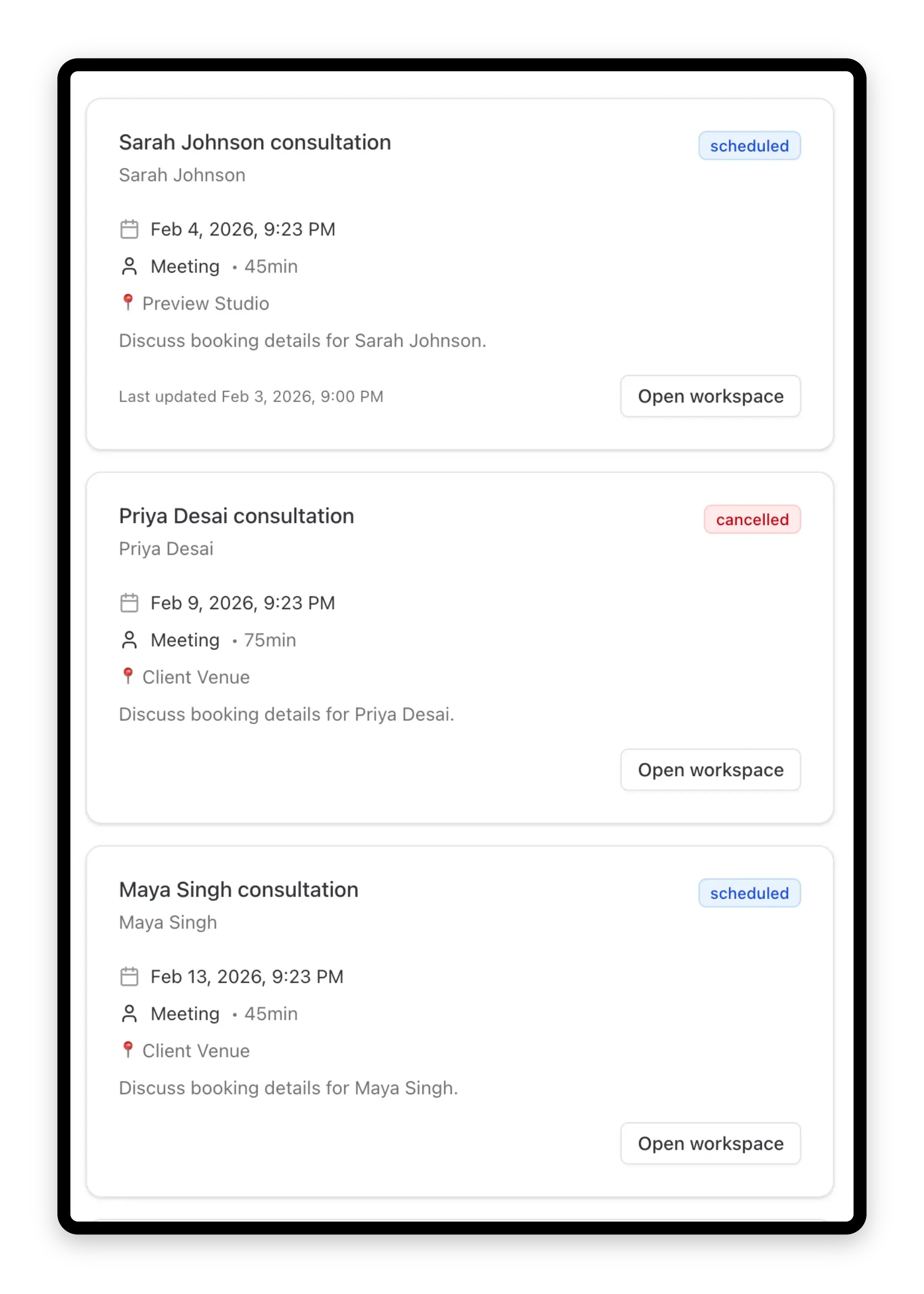 Schedule and track cake tastings and design consultations with clients. Keep consultation notes linked to the enquiry so everything is in context when you follow up.